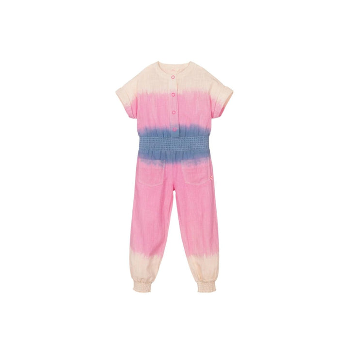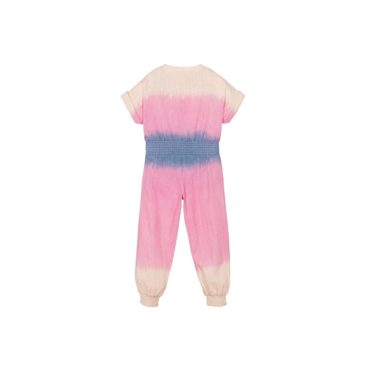 Dreamy pink and purple ombre jumpsuit for girls by designer Billieblush, made in soft, lightweight cotton. It has bright neon pink popper fastenings, cool turn-up sleeves and pockets on the front for a fun, bohemian style. It has an eye-catching rubberised glitter logo on the back, with a comfortable elasticated waistband and hems.