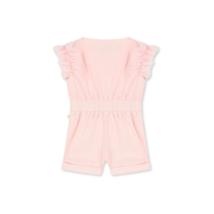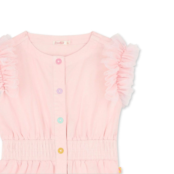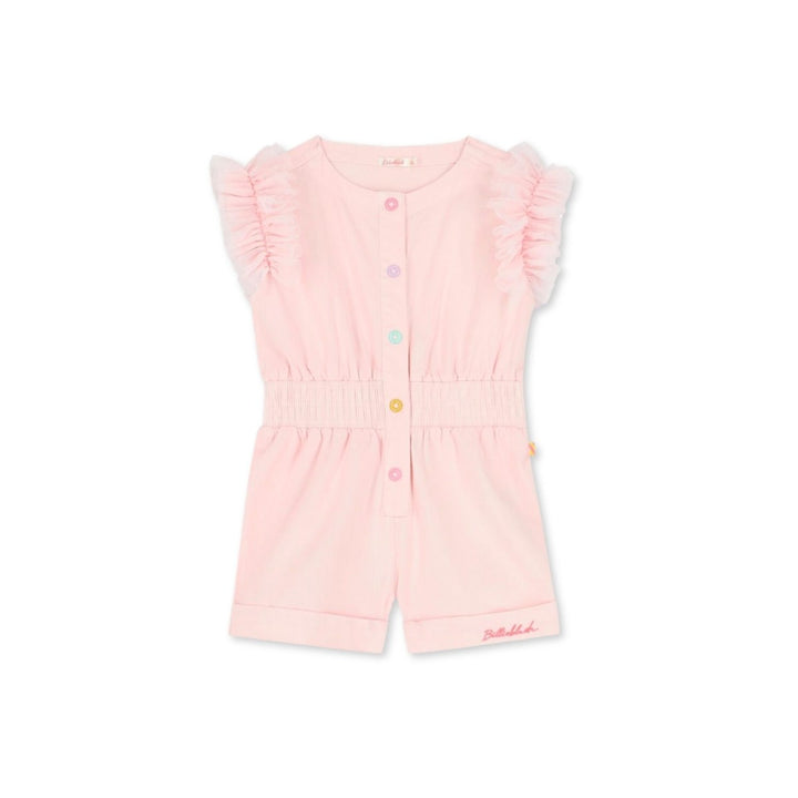 Pink playsuit for girls by Billieblush. Made from soft cotton twill, it features ruffled tulle trims to the shoulders and an embroidered logo in pink on one leg. It has an elasticated waistband and fastens with colourful snap closure buttons down the front.