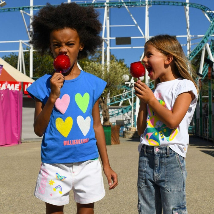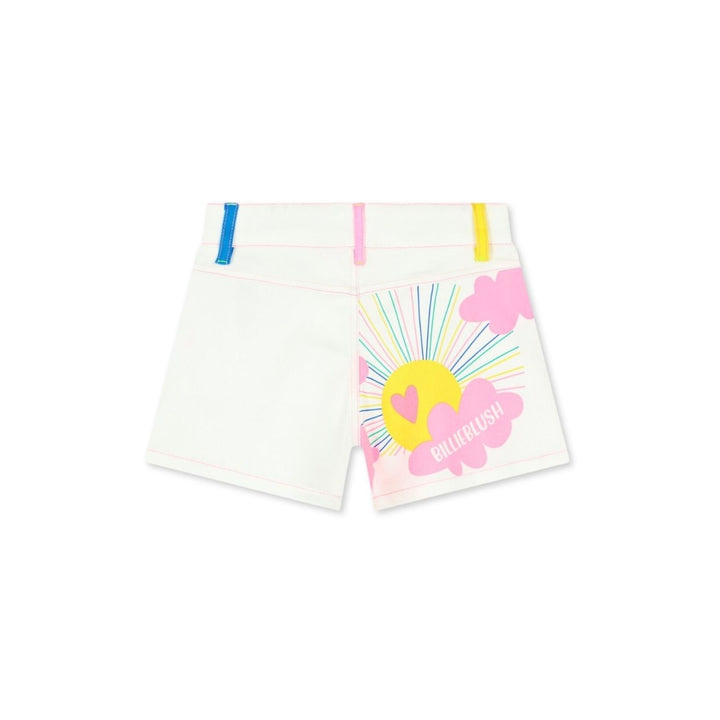 White shorts for girls by Billieblush. Made from soft cotton, they have multicoloured belt loops and graphic design on the front and back with a logo print. Neon pink stitching and pink button to fasten at the front with two front pockets.