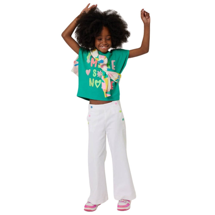 White cotton twill trousers for girls from Billieblush, in a modern, flared-leg style. Casual and comfortable, they have an adjustable waistband to ensure a good fit and they fasten on the left side with colourful sparkling poppers. For a symmetrical finish, the right pocket has decorative poppers above and one of the back pockets is printed with a palm tree logo motif in bright neon colours. The soft fabric has a hint of stretch for comfortable movement.