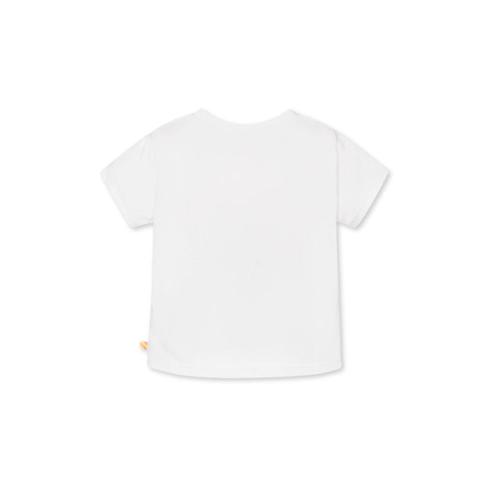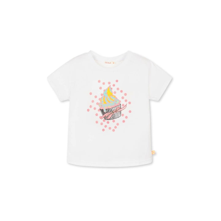 A white short-sleeved T-shirt for girls by Billieblush, made from soft organic cotton jersey. Part of the Happy Birthday collection, it has a cupcake design with glittery pink polka dots and neon yellow sequined sprinkles for a fun look. This tee comes with a bright pink hair elastic to accessorise their look.