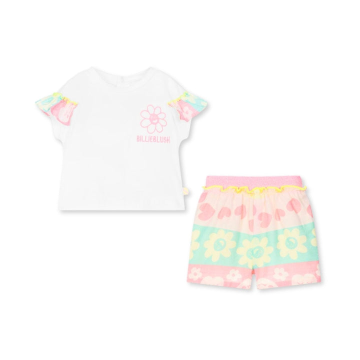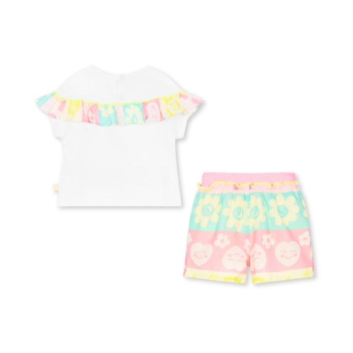 Cute white and pink shorts set for little girls by Billieblush, made in soft cotton jersey. The white T-shirt has a neon pink floral motif embroidered on the front and colourful flutters on the sleeves. It fastens with simple poppers on the back for ease when dressing. The pink and yellow pastel shorts have a sweet heart, floral and sunshine print, and are finished by a glittery pink waistband with a comfortable stretch.