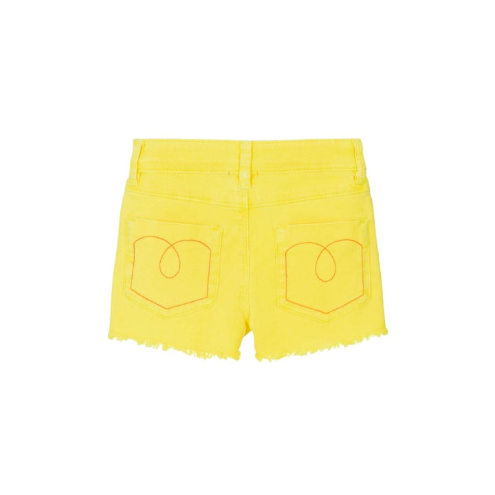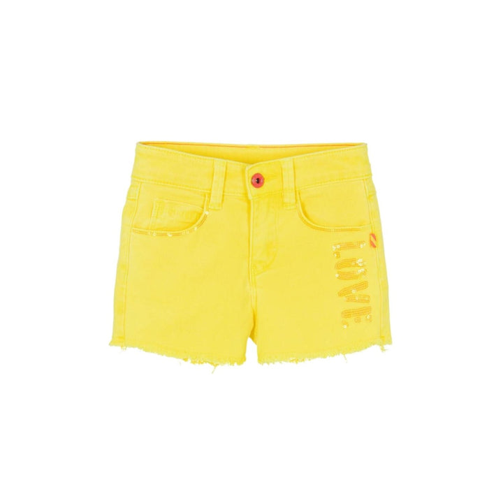 Add a pop of colour to any outfit in these bright yellow shorts for girls, by designer Billieblush. Made in soft cotton twill, they have a glittery button fastening with a gold zip, a sequined LOVE slogan and the brands iconic tag logo on the front. For a cool, girly look, they have classic five pocket styling with sequins on the front, and heart-shaped neon pink stitching on the back. There is an adjustable waistband and frayed hems.
