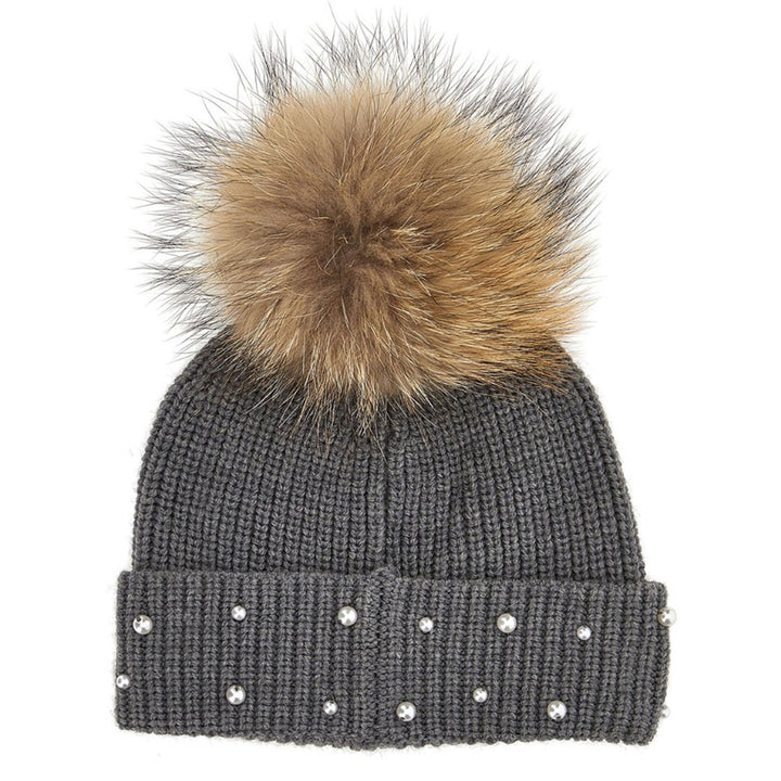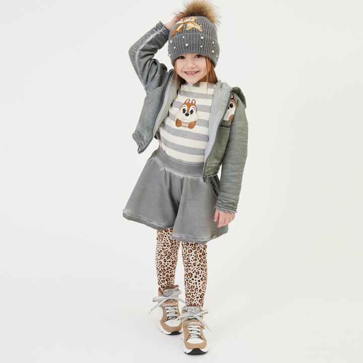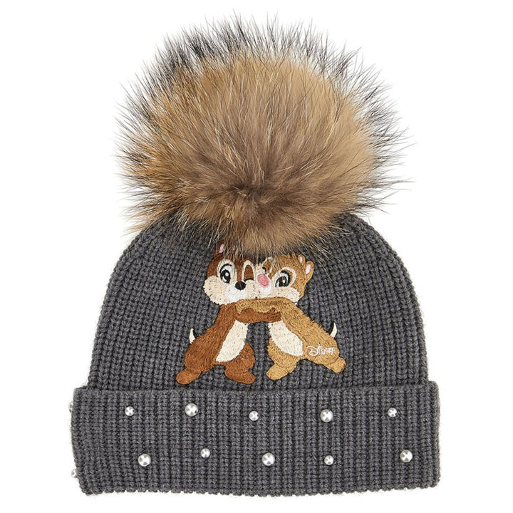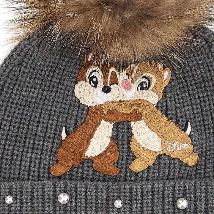Grey hat with pearls, eco fur and an embroidered print of Chip 'n Dale by Monnalisa. This item is from the Chip 'n Dale collection.