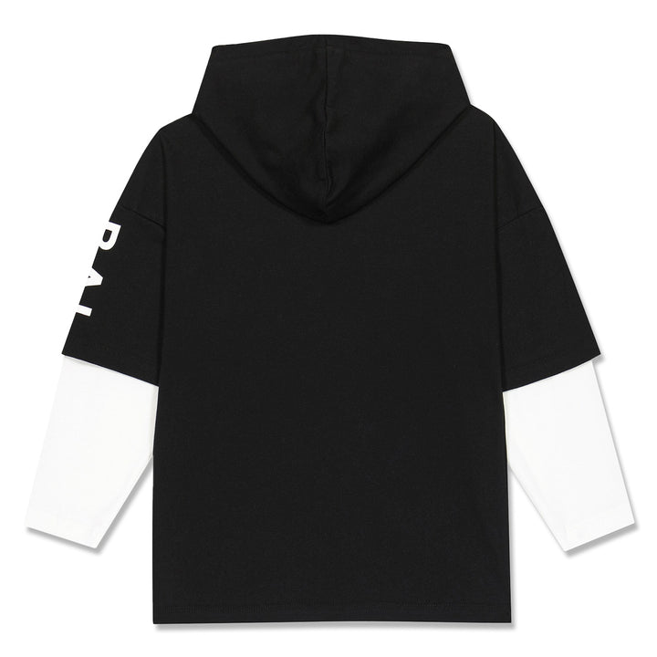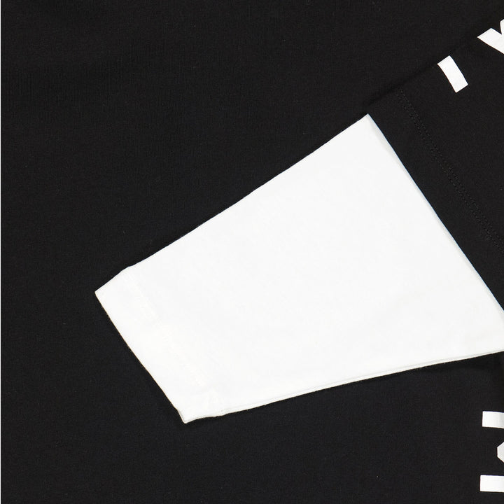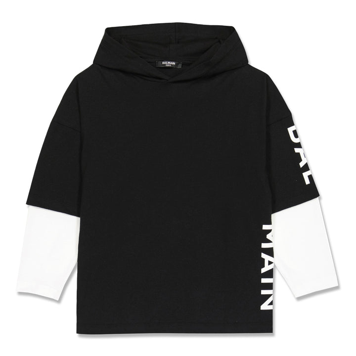 This super stylish black hoodie t-shirt by Balmain is a must-buy for your kid. The complete black t-shirt with hoodie features a brand logo print on one side with half black and half white sleeves. The brand print, the hoodie of the t-shirt, and the