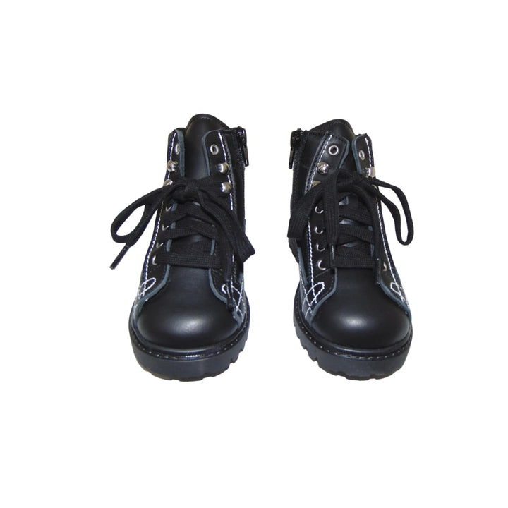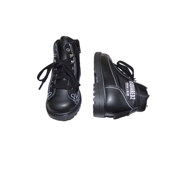 Black boots with a medium heel sole and a chain on side. The lace on the top gives it a multi functional look with white thread look over all the shoes. The perfect winter accessory for your kids.