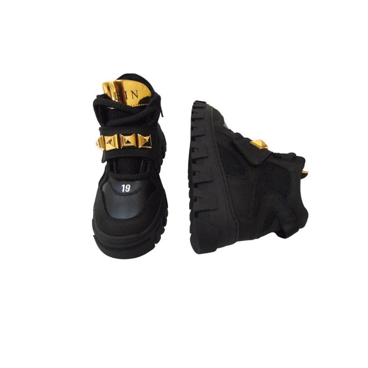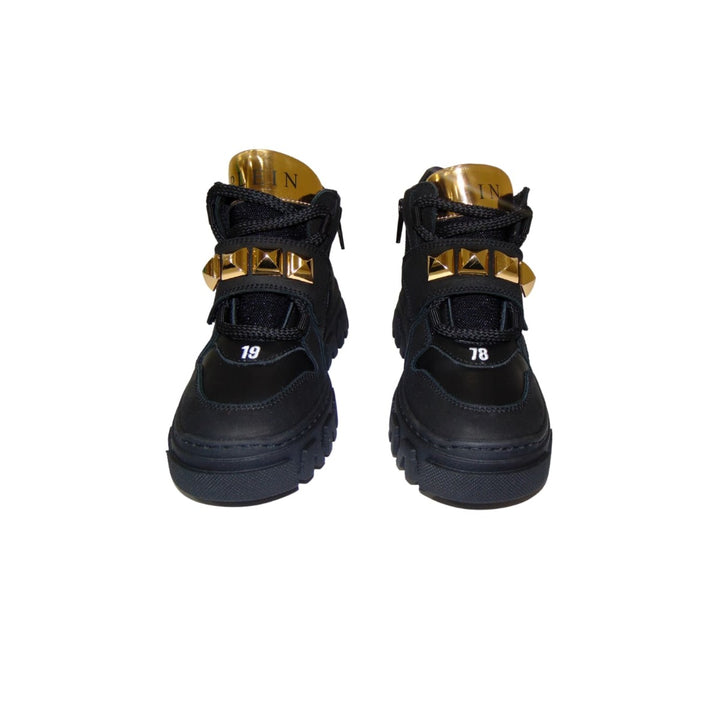 Black shoes with a touch of gold sharp end look on the top. The lace on the top gives it a multi functional look with a pp logo. The perfect party accessory for your kids.