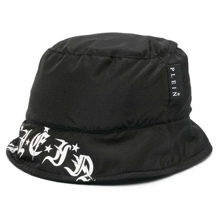 Black logo-print bucket hat from Philipp Plein Junior featuring black, logo print to the front, mini logo tag, flat crown and dropped narrow brim.