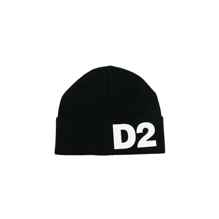 logo-print turn-up beanie from DSQUARED2 KIDS featuring black/white, wool blend, knitted construction, logo print to the front, turn-up brim and straight hem.