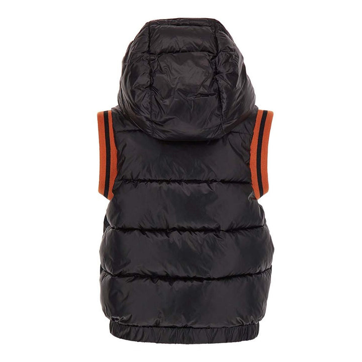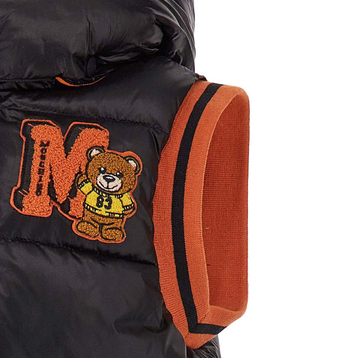 Black Logo Puffer Hoddie Vest for boys and girls by Moschino Kid.made in silky, lightweight nylon. Lightly padded, it has a Moschino Teddy Bear on the chest.