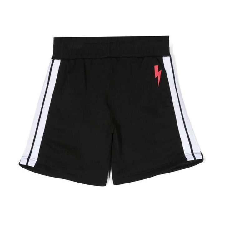 Boys Black Logo Shorts From Neil Barrett Kids With An Elastic Waistband . It Features White Strips With Black Pippin On Both Sides Of The Shorts With A Black Drawstring On Waistband For Extra Comfort And Fit.