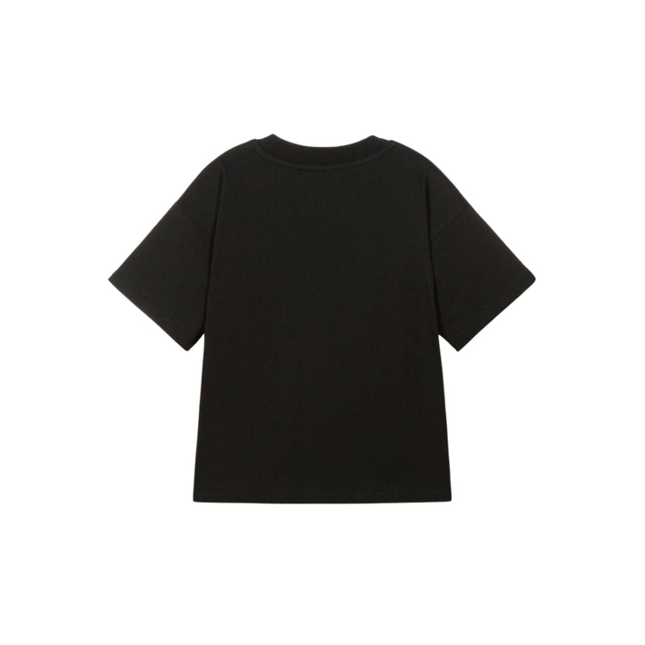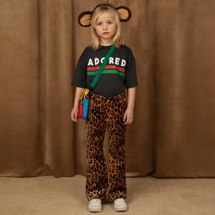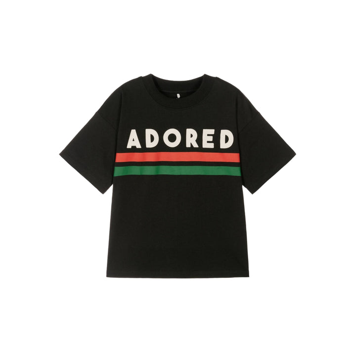 A washed black graphic T-shirt for boys and girls by Swedish brand Mini Rodini, made from soft organic cotton jersey. Fun for casual wear, it has an ivory 'Adored' slogan print with red and green stripes. It has a ribbed crew neck and dropped shoulde