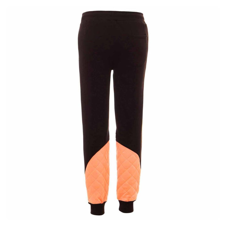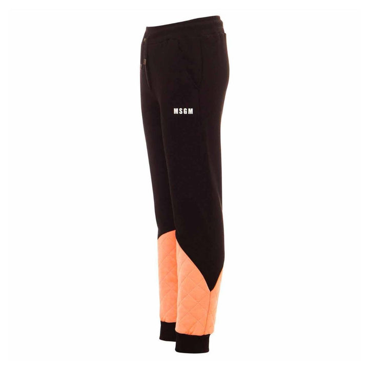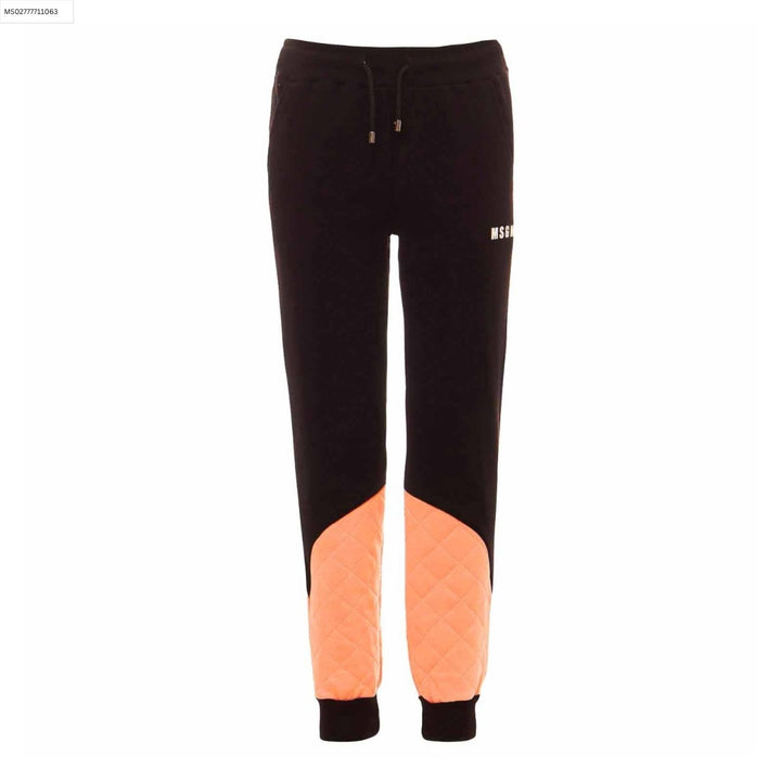 Girls black joggers by MSGM, made in soft and stretchy cotton jersey with a fleecy feel inside. They have pink quilted panels on the legs, two front pockets, and an elasticated waist. There is a white logo print on the front, and a logo tab on the ba