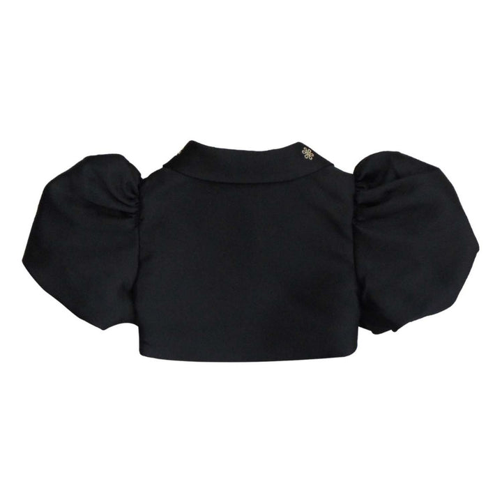 Gorgeous black bolero jacket for girls by luxury designer Elie Saab. Perfect for a special occasion, it is made in mid-weight silk blend satin with large, puffed bubble sleeves. The collar glistens with flowers and logos beautifully embroidered in go