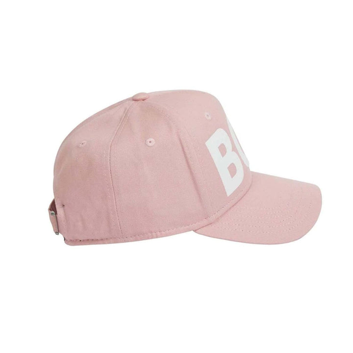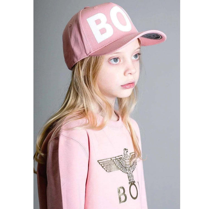 Kids black five panel snapback cap with white BOY type printed on front and black adjustable strap.