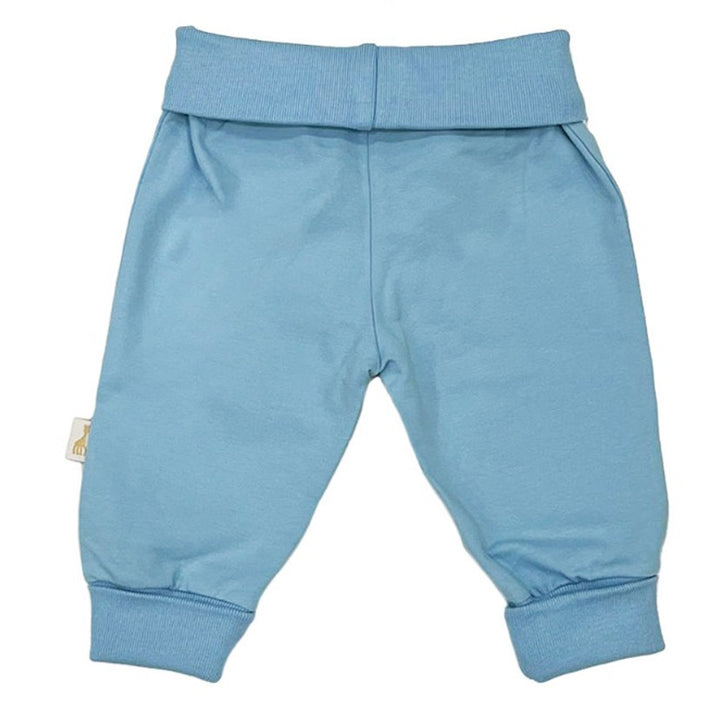 A pair of BLUE joggers for baby boys and girls from Sophie la Girafe. Made in comfortable, mid-weight cotton jersey, they have the famous giraffe icon embroidered in blue by one of the front pockets. The elasticated waistband is for a comfortable fit