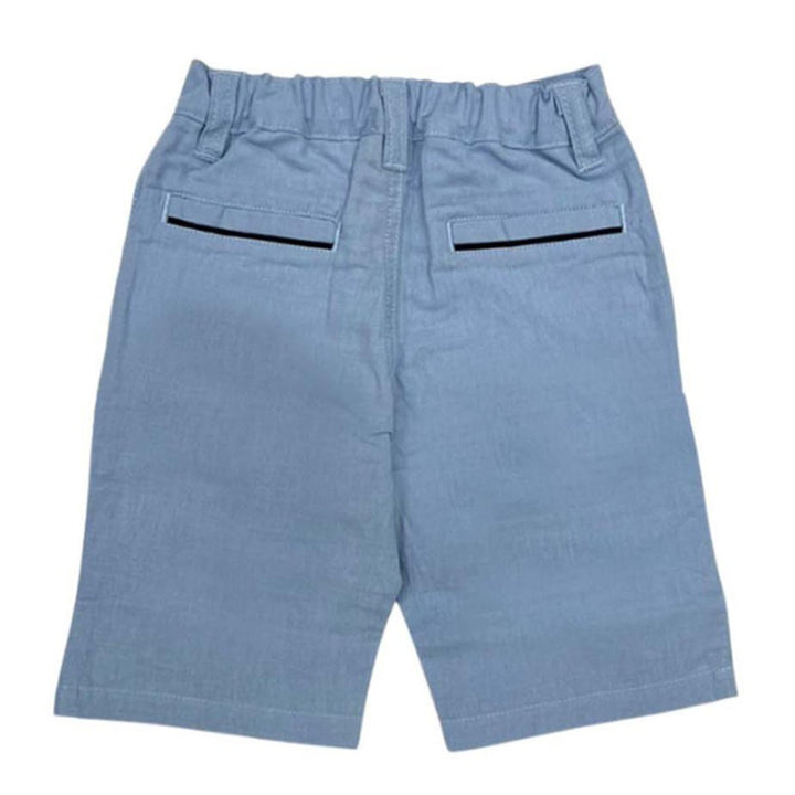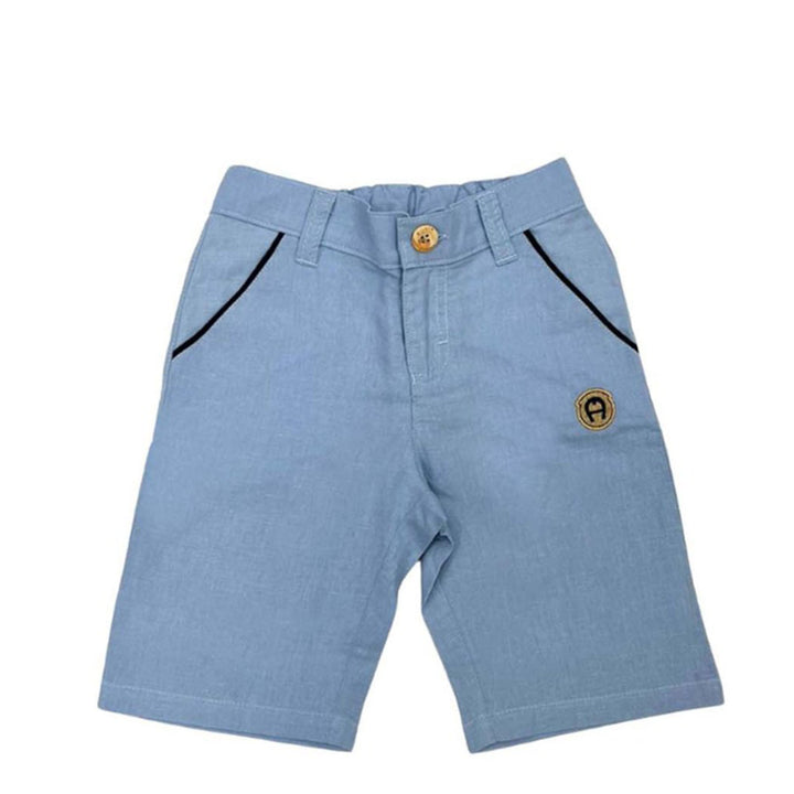 Light blue, Bermuda length shorts for boys by AIGNER. Cool and casual, they have a signature 'A' horseshoe logo patch in gold and navy blue. They are made in lightweight cotton with slanted front pockets, two back pockets and an adjustable waistband