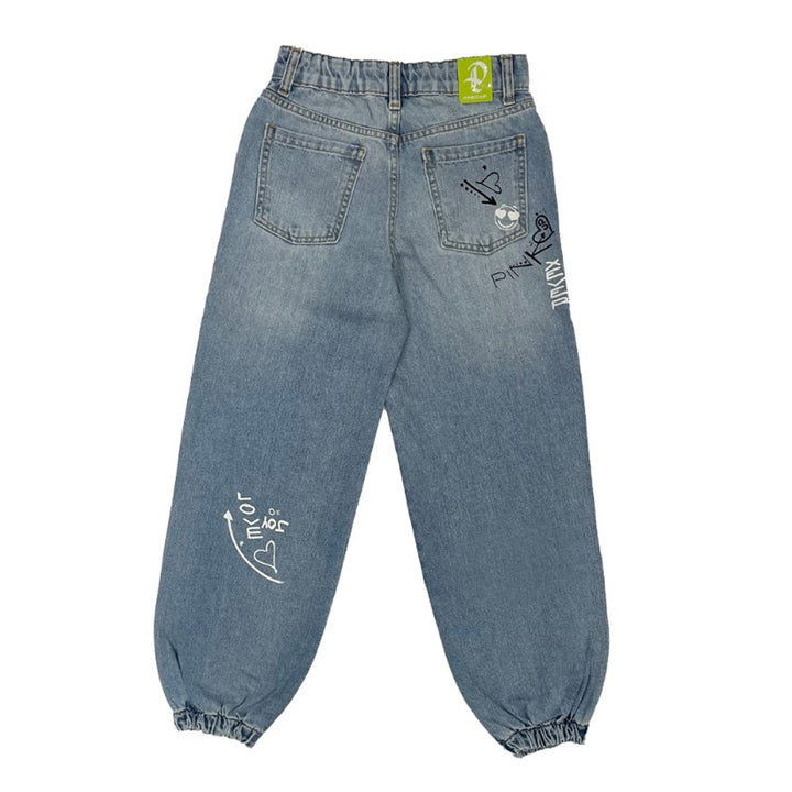 Light blue denim jeans for girls, made in soft stretch denim. Adding a cute touch, they are embroidered with teddies and logos in pink, beige and gold.