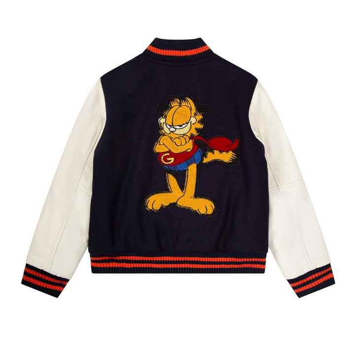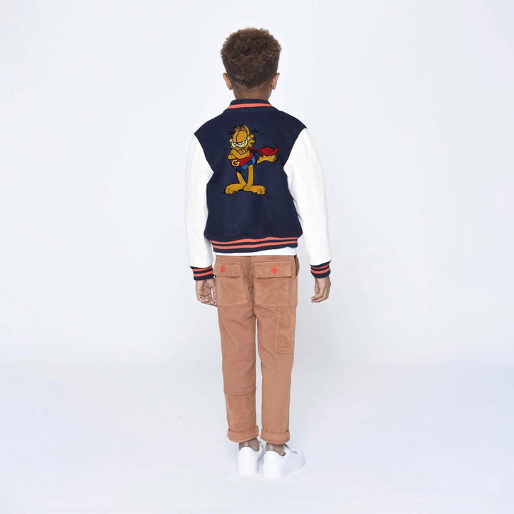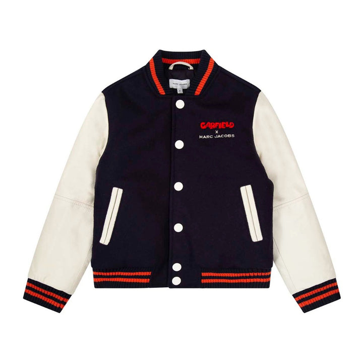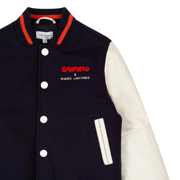 Boys varsity-style padded bomber jacket in navy blue and ivory from American designer MARC JACOBS, in collaboration with Garfield. With red and blue stripy knitted trims, the soft felted wool body has a quirky Garfield superhero character appliqué o