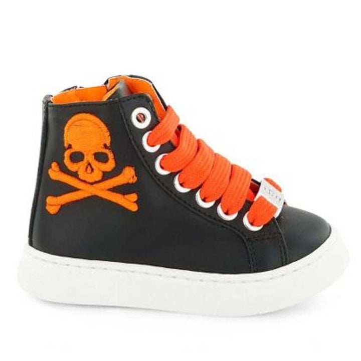 Black high‑top sneakers featuring bright orange contrast laces and lining for a bold, playful look. The side is detailed with an orange skull‑and‑crossbones graphic, while the chunky white sole keeps them comfortable and stylish for everyday wear.