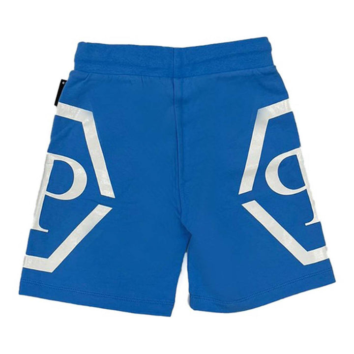 Blue bermuda shorts in fleece with brand logo, leather applications, solid color with print, french terry lining, multipockets, wash at 3? c, do not dry clean, do not bleach, do not tumble dry, iron at 11? c max, contains non-textile parts of animal