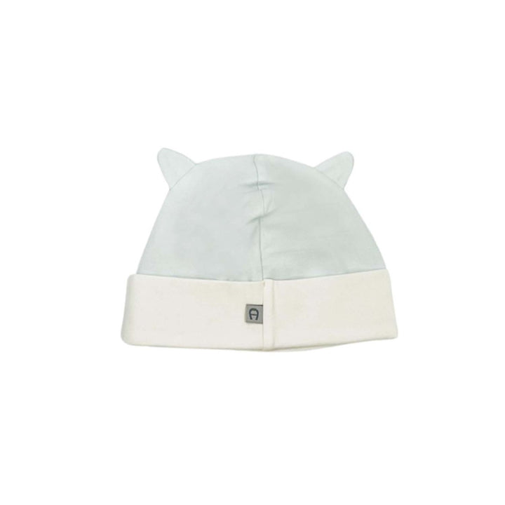 Blue layette cap for baby boys and girls by AIGNER, with cute little ears on the top. Made in super soft Pima cotton jersey, it is comfortable for baby's delicate skin. The contrast pale ivory brim has the brand's signature 'A' horseshoe logo embroid