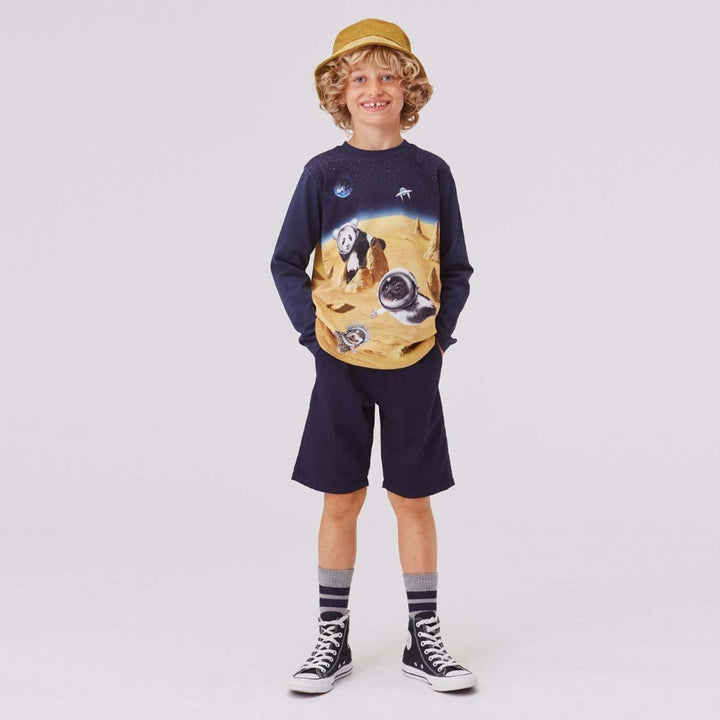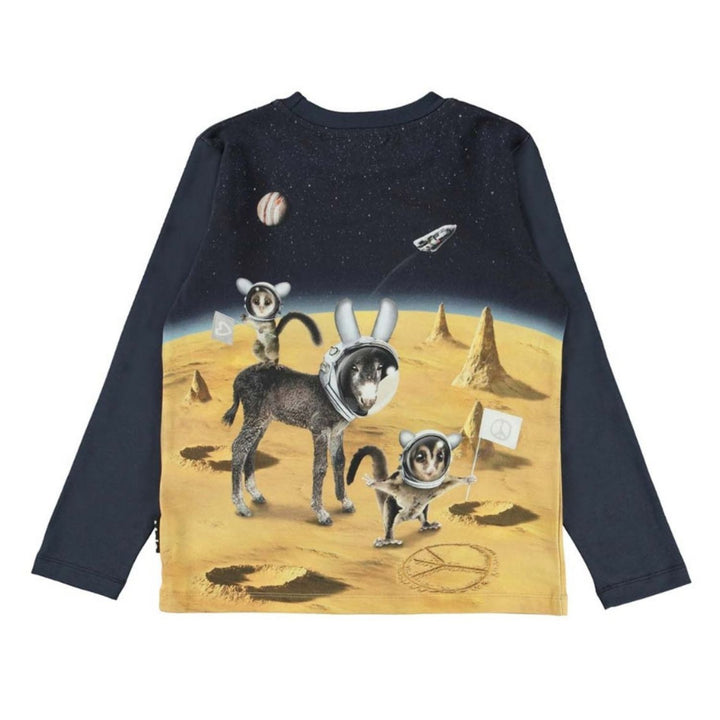 Easy-wearing navy blue top for little boys by Molo, made in mid-weight organic cotton jersey. Fastening with poppers on one shoulder, it has an planet surface print on the front with cute animal astronauts.