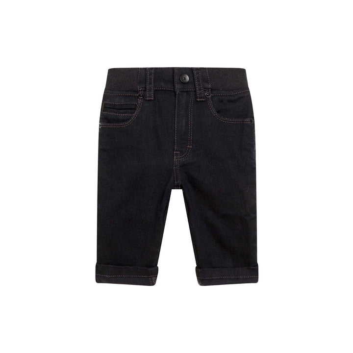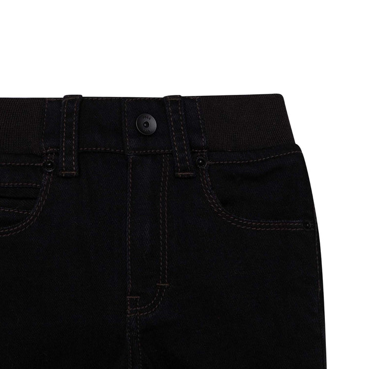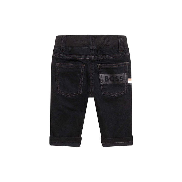 Cool black slim-fit jeans for little boys by BOSS. with a black logo print and the striped tab on one of the back pockets. In a five-pocket styling with modern all-black. logo branded hardware. they are made from soft and stretchy cotton denim. Fastening with a hook and zip on the front. the waistband is ribbed and elasticated for comfort.