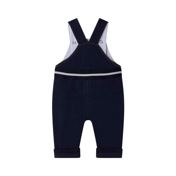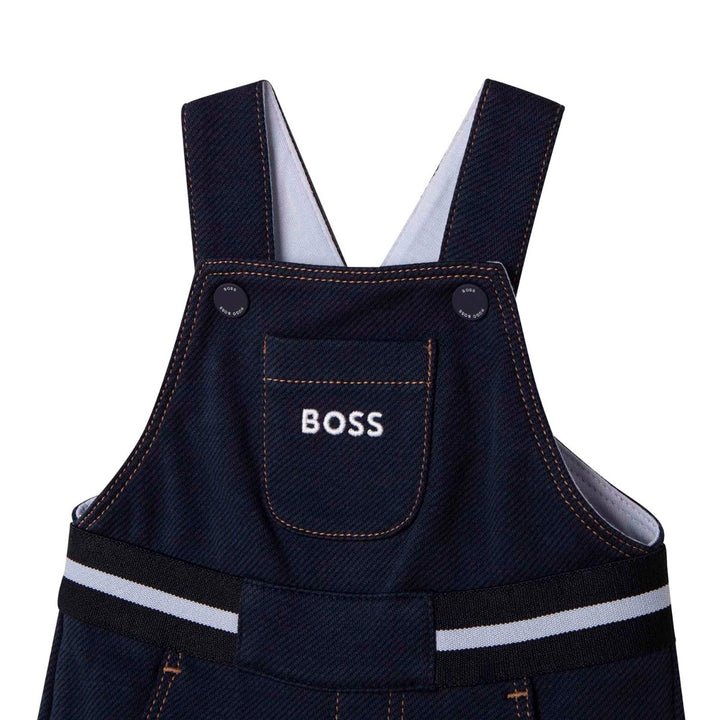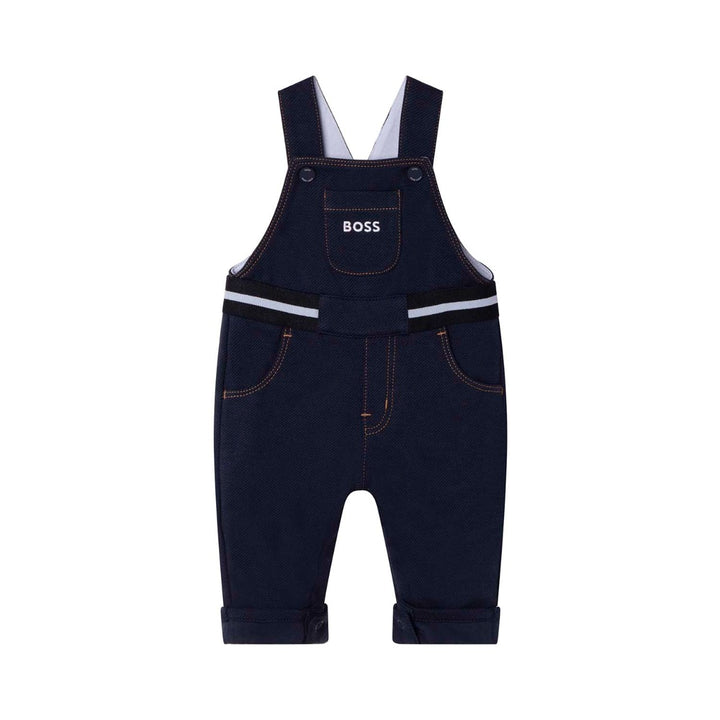 Baby boys navy blue dungarees by BOSS, made in soft cotton twill jersey with a comfortable jersey lining. They have contrast orange stitching, adjustable straps with branded poppers, and striped black and white web tape on the waist. There are pockets on the front, with the designer's logo embroidered on the chest pocket.