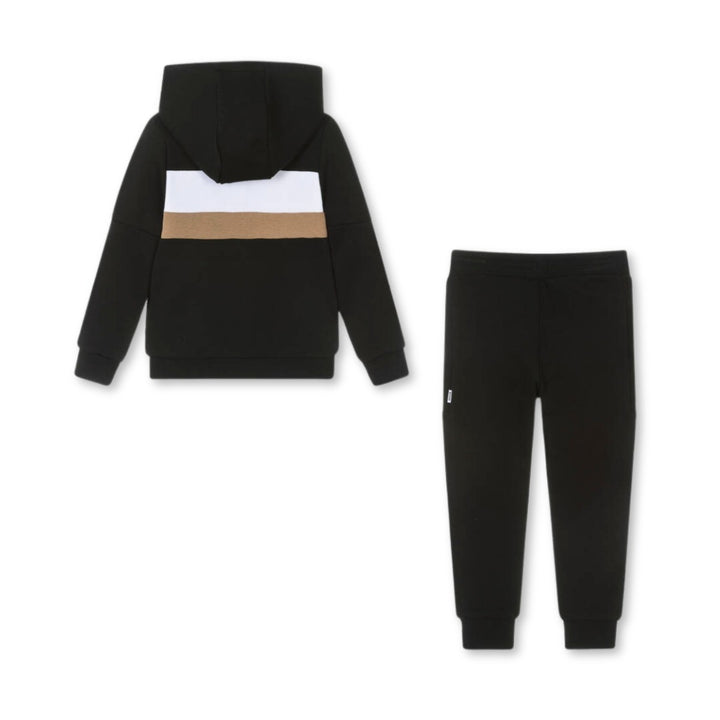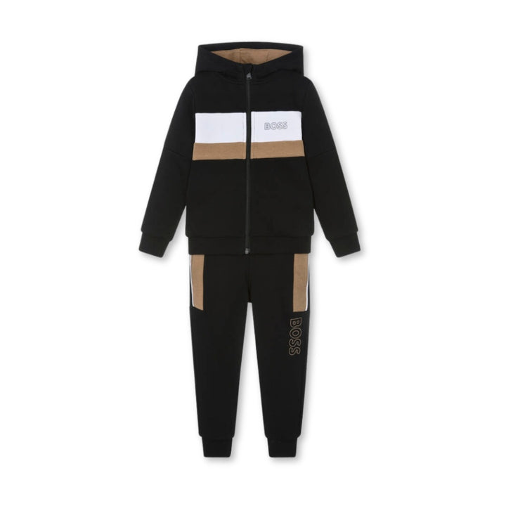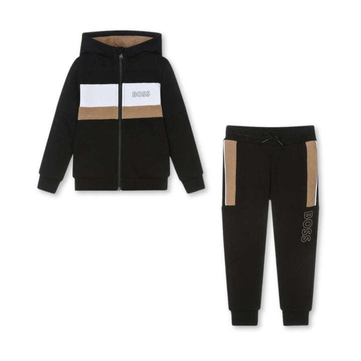 Black and beige colourblock tracksuit for boys by BOSS, made in a soft, mid-weight cotton jersey blend. The zip-up top has ribbed trims, side seam pockets and a jersey-lined hood. Recognisable logo lettering can be seen on the chest. Great for at home or a casual day out, the matching cuffed joggers have concealed side seam pockets and a comfortable drawstring waist.