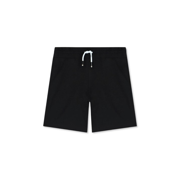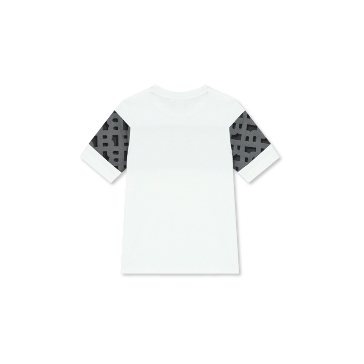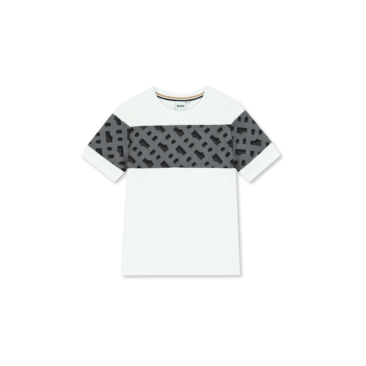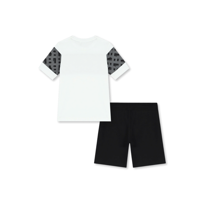 Designed for boys, this white and black shorts set by BOSS is made in comfortable cotton jersey. Ideal for casual outings, the short-sleeved T-shirt has a dark grey monogram panel across the front and a logo tab stitched on the side seam. The paired shorts have a bold white logo print on the leg, along with concealed side seam pockets. The adjustable drawstring ties are capped with the brand's signature colours.