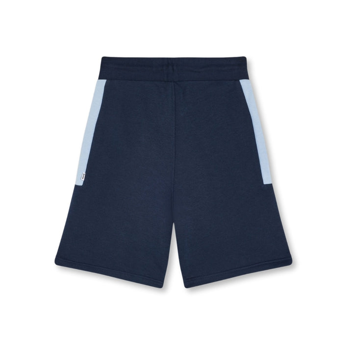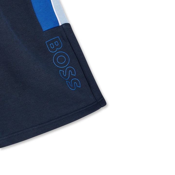 Sporty blue shorts for boys by BOSS, with beige and white trims. For designer appeal, they are printed with a beige logo on one leg. Casual and comfortable, they are made in mid-weight cotton-blend jersey. They have concealed side seam pockets, with an elasticated drawstring waist for an ideal fit.