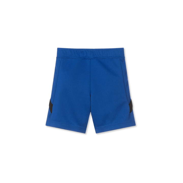 Royal blue shorts for boys by BOSS, panelled in black and white. A cool style created in celebration of the 2024 European Football Championship, they are made in silky, stretchy jersey and signed with a football emblem above the hem. These sporty shorts have handy side pockets, a stretchy waist, and a complementary logo graphic on one leg.