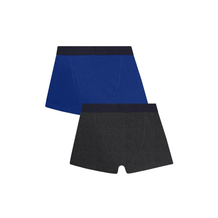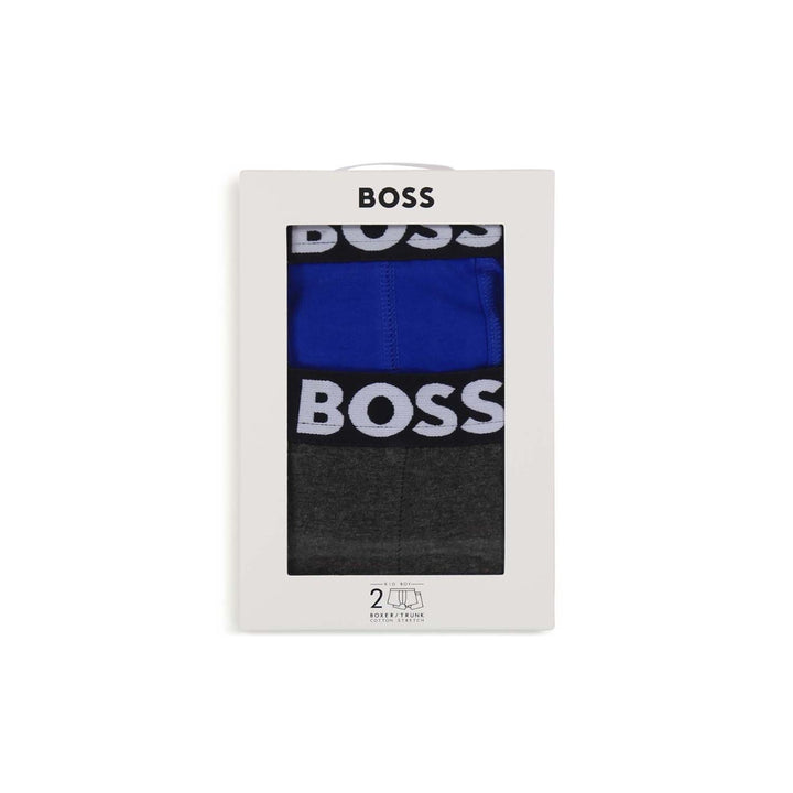 For boys, pack of two boxer shorts in black and Blue by BOSS with their branded logo waistband. Cool and comfortable, made in soft cotton jersey they also have logo prints on one leg.