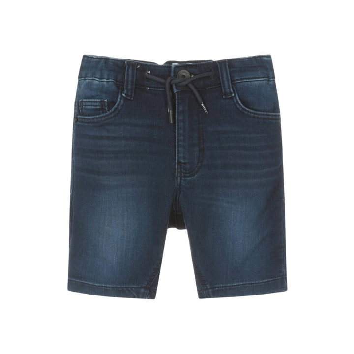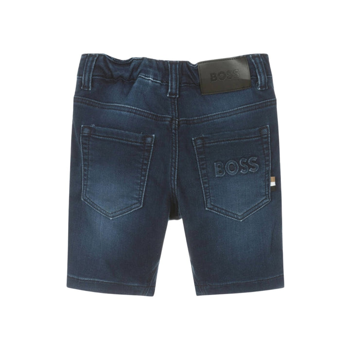 Boys dark blue shorts by BOSS, made in soft cotton-rich jersey with the look of denim. Ideal for casual dressing, these comfortable shorts have an easy drawstring waist and a button and zip fastening. An embossed logo can be seen on the back pocket, along with a tricolour logo tab. A branded patch is sewn on the back of the stretchy waistband and the cuffs can be turned up or down for different looks.