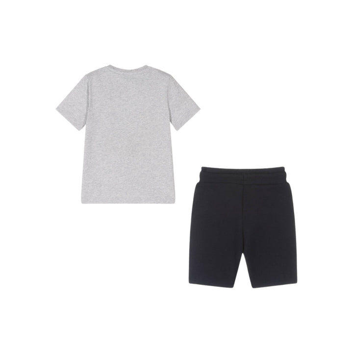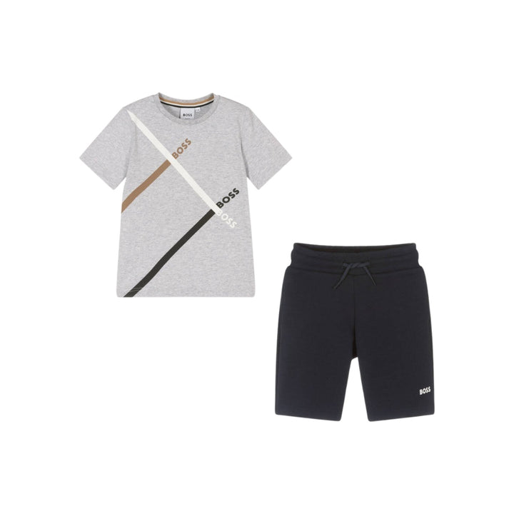 Mini-me shorts set for boys by BOSS, made in soft cotton jersey. The grey T-shirt is printed with an abstract logo in the brands signature colours for instant recognition. The navy blue mid-weight jersey shorts have an elasticated waist which can be adjusted via drawstring for a comfortable fit and is finished with a small white rubberised logo on the front.