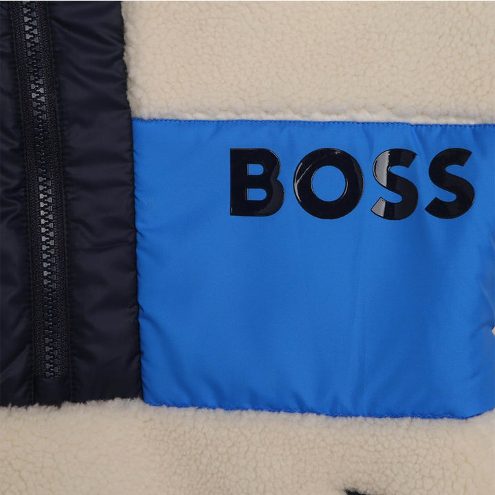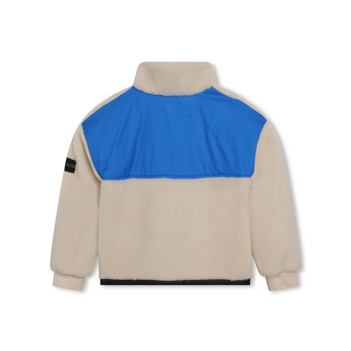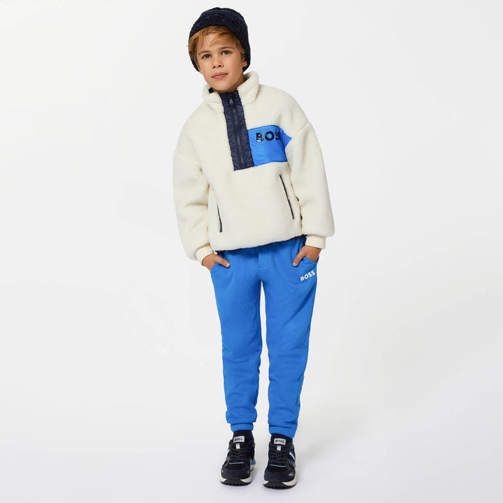 Ivory sweatshirt for boys by BOSS, made in warm and cosy sherpa fleece. Fully lined for comfort, it has a half zip collar and front pockets to keep hands warm. There are navy blue trims and bright blue silky panels on the front and back. There is a navy blue rubberised logo on the chest panel for a bold designer statement.