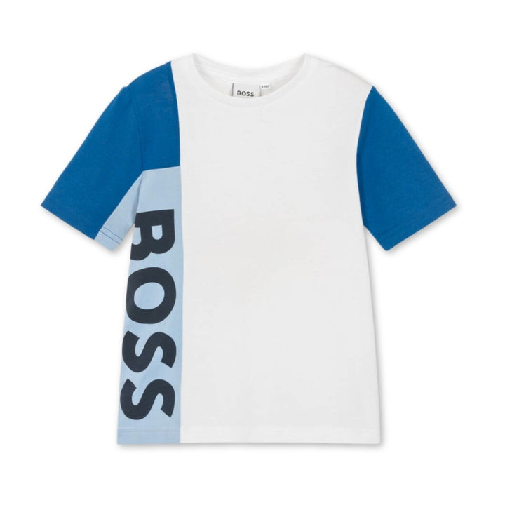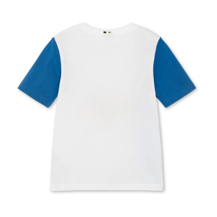 A stylish, white T-shirt for boys by BOSS, made in soft cotton jersey, with contrast blue short sleeves. For instant designer recognition, it has a bold, navy blue vertical logo motif on the front. Great for casual wear, this crew neck tee has a relaxed fit. Adding a signature finish, the brand's tricolour trim can be seen on the back of the neck.