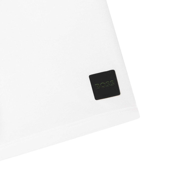 Bright white shorts for boys by BOSS, made in soft and comfortable jersey. With a touch of athletic style, these casual shorts have a rubberised black logo patch on the front, with a cool neon green 3D effect. The design also includes slanted pockets on the hips, a single pocket on the back, and an adjustable waistband.