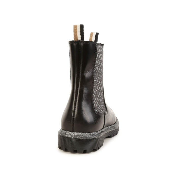 Mini-me black leather Chelsea boots for girls by BOSS. Great for making a modern statement, they have stretchy grey glitter trims in the iconic monogram pattern and signature detailing on the pull tabs. A logo is embossed on the side, with a glittery silver midsole. They are complete with a soft faux fur lining, a smooth textile insole and a chunky non-slip rubber outsole.