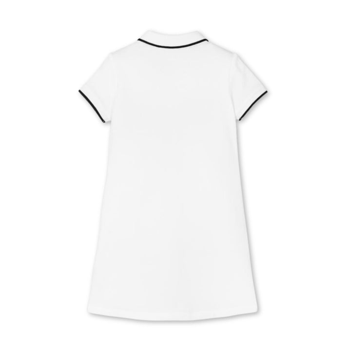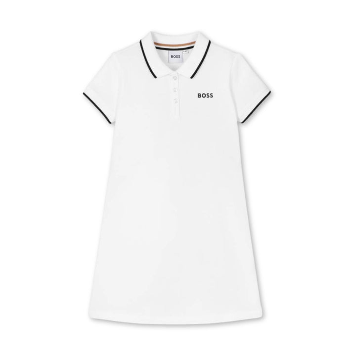 Sporty white cotton polo shirt-style dress for girls by German brand BOSS, with black tipping on the ribbed white collar and cuffs. A black logo is printed on one side, with logo button fastenings on the placket and the designer's signature tri-coloured trim on the inside of the neckline.