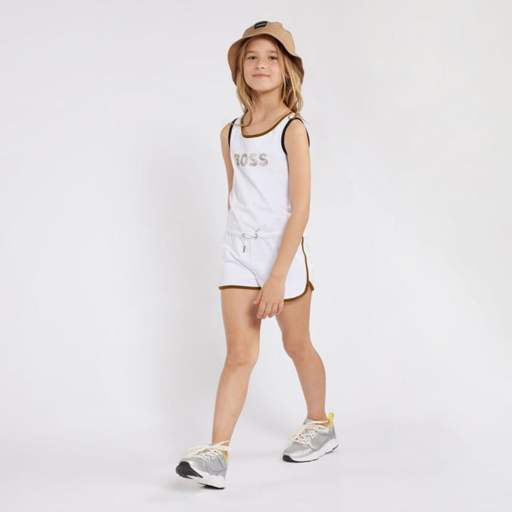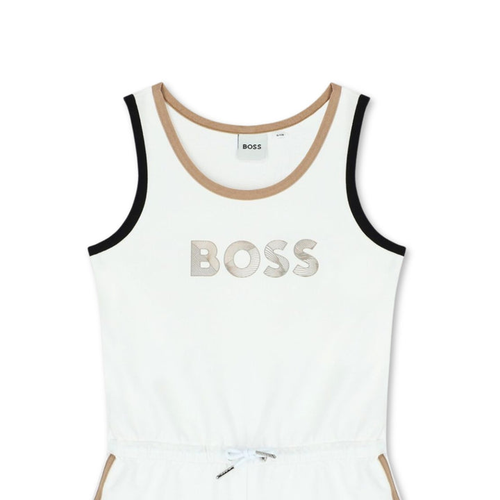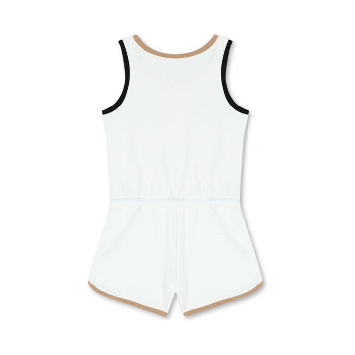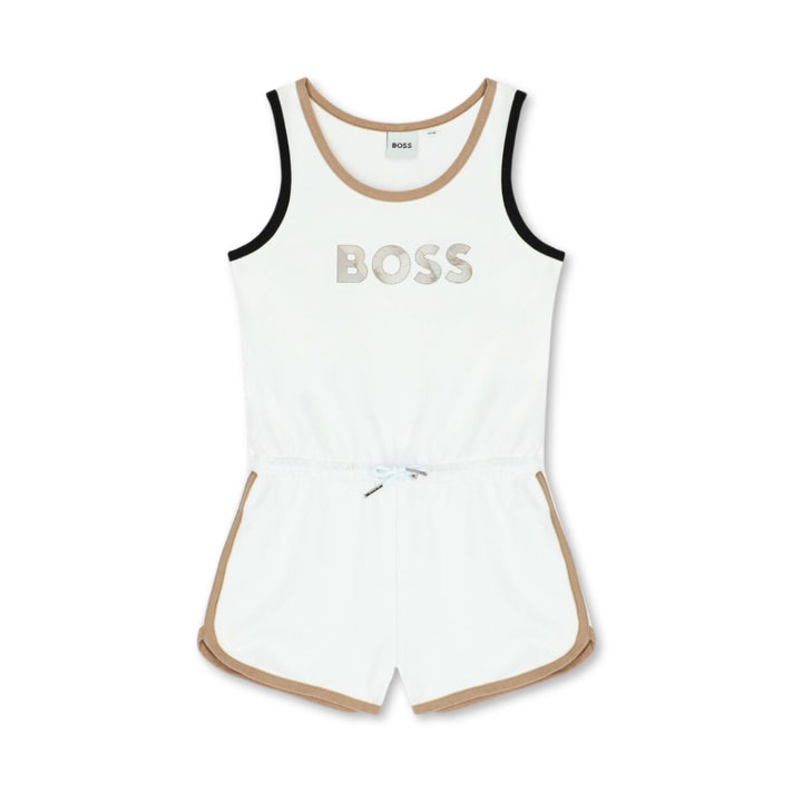 White jumpsuit for girls by BOSS. Made from soft cotton jersey with the brands logo print on the chest. It has a beige and black trims and finished with an elasticated waist and drawstring for comfortable fit.
