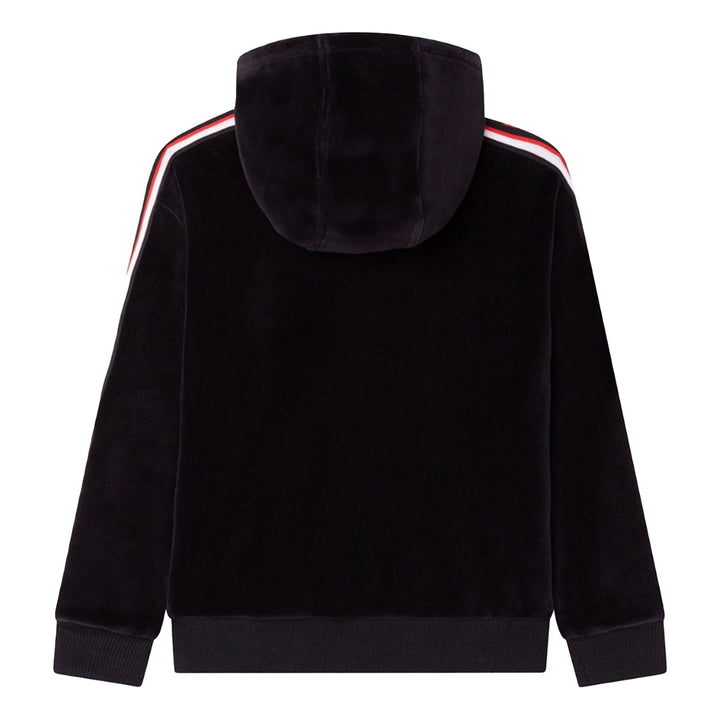 Lanvin black hooded cardigan with a zip in fron and a red border on the side from shoulder to hand length sleeve. Your boys will rock the cardigan.