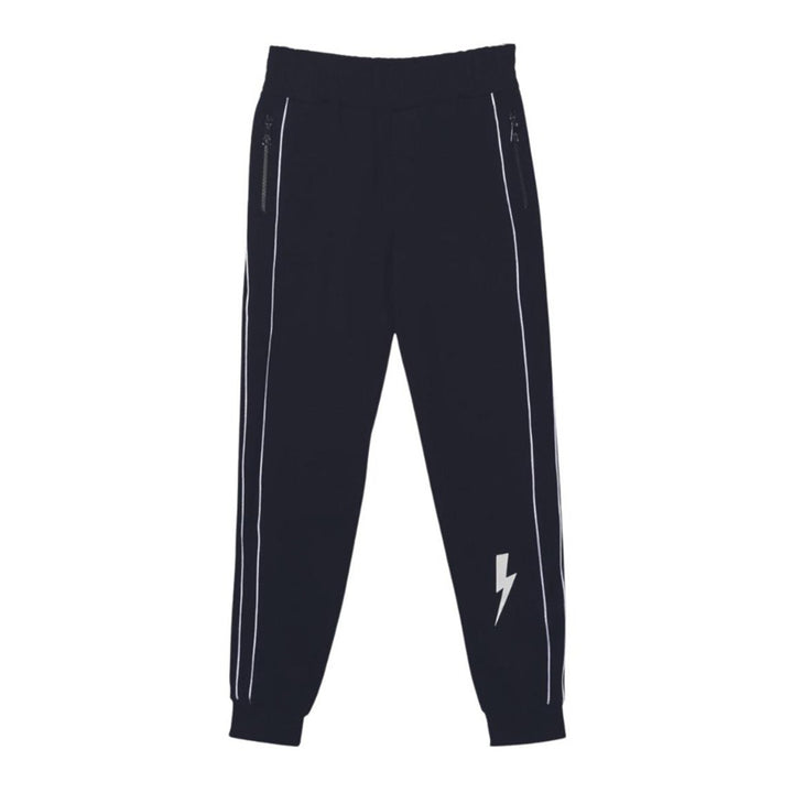 Neil Barrett Kids joggers in full black and white pipin strip on the side. With chain pockets and prints. Perfect for playdates and outdoors.