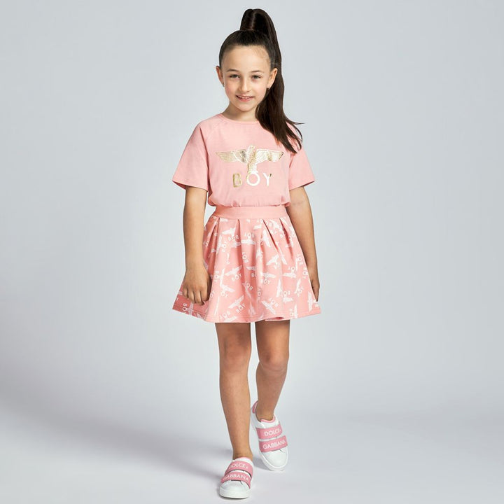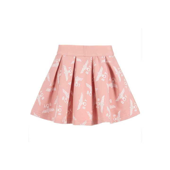 Logo repeated stretch-cotton skater skirt in pink with Comfort stretch,b.o.y and eagle print repeat pattern throughout
