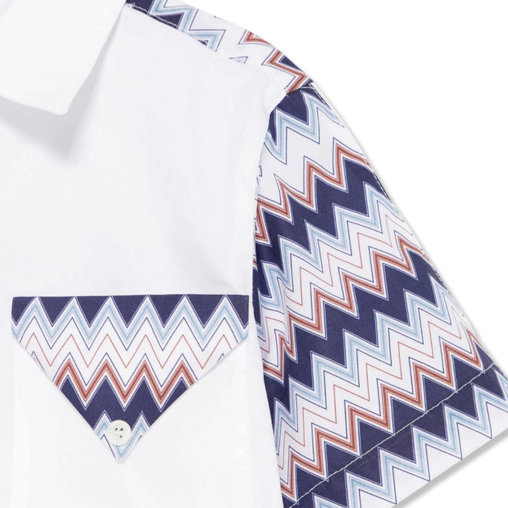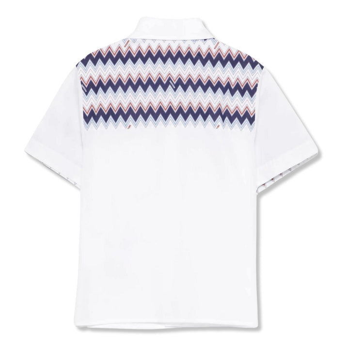 Add a touch of iconic Italian style to your child's wardrobe with this Missoni Kids short-sleeve shirt. Crafted from premium cotton, this crisp white shirt is elevated with the brand's signature zigzag print on the sleeves and chest pocket. The geometric pattern in navy, white, and earthy tones brings a modern yet timeless appeal, perfectly balancing classic tailoring with playful design. A concealed button placket ensures a sleek finish, making it an excellent choice for both casual and smart occasions.