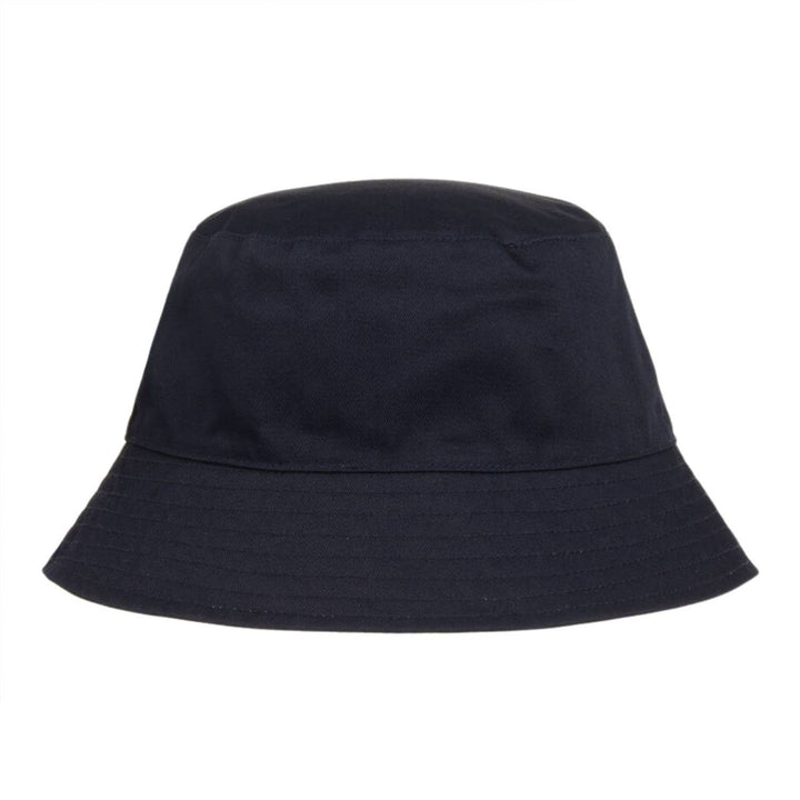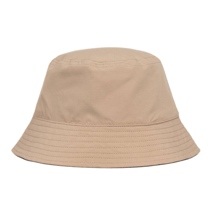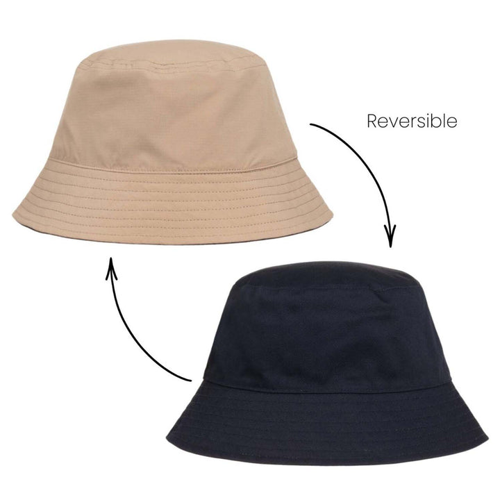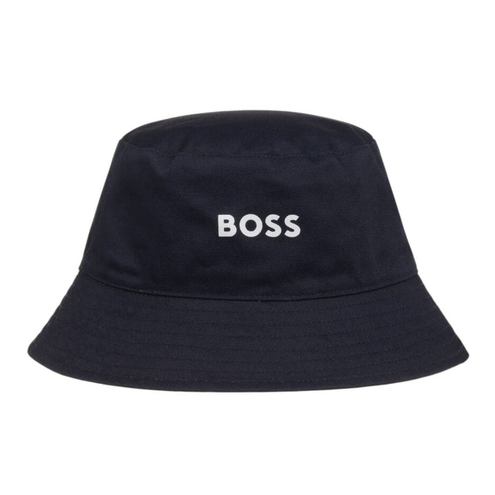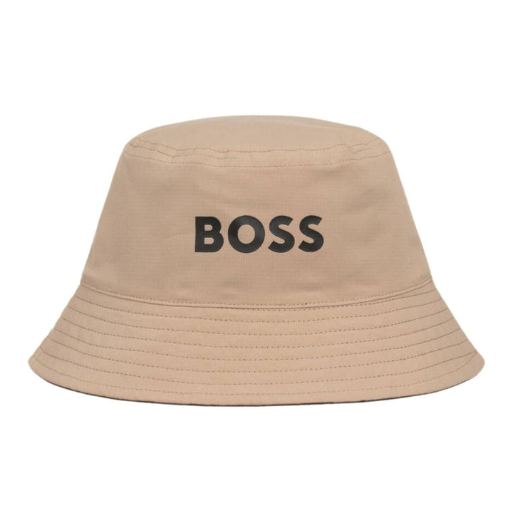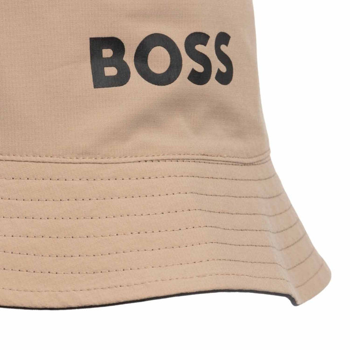Reversible bucket hat for boys by BOSS, in versatile beige and dark navy blue shades. The beige side is made in durable ripstop fabric with a black logo print and the reverse is made in twill with a contrasting white logo.