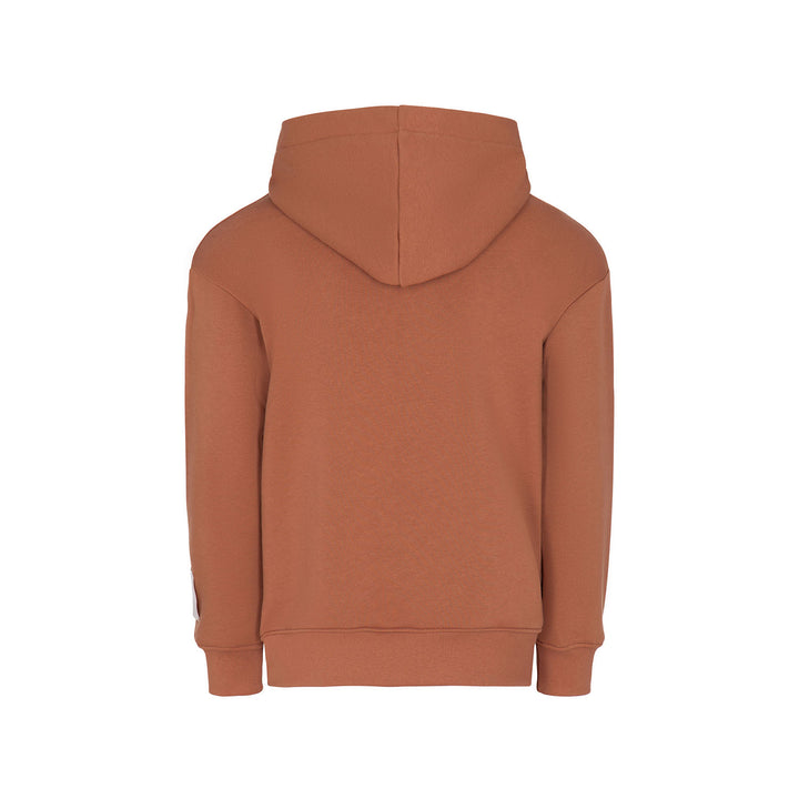 Dark beige hooded sweatshirt for boys by MSGM, made in comfortable cotton jersey with a cosy fleece feel inside. For a stylish designer touch, it has an angular flocked red logo on the chest and an embroidered logo patch on one sleeve. It is finished