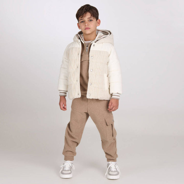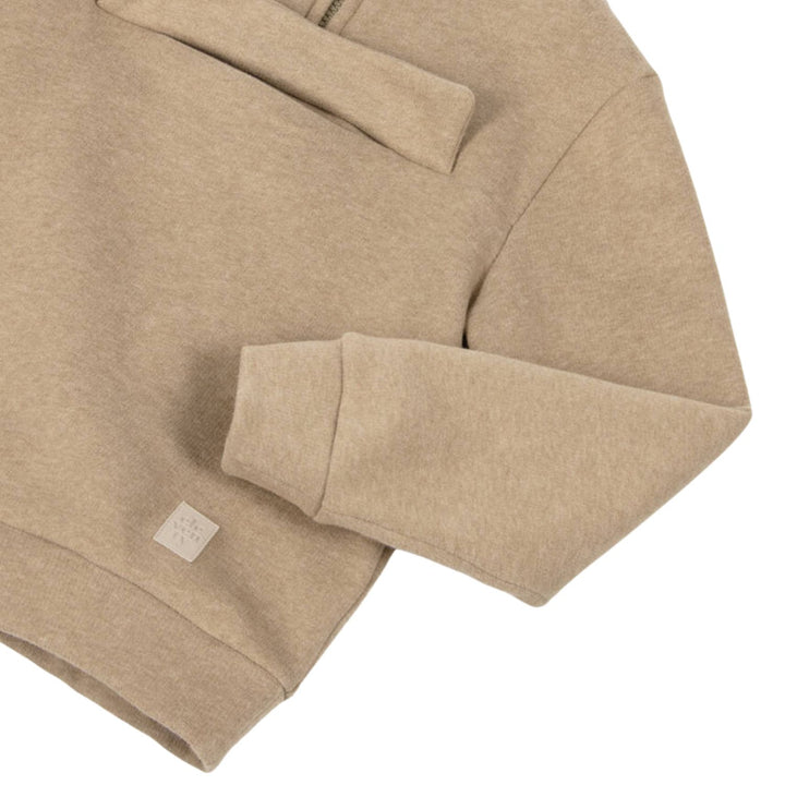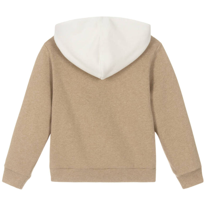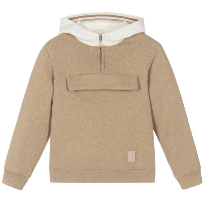 Beige sweatshirt with an ivory hood for boys by Italian label Eleventy Milano, combining practicality with style. Made from a super soft cotton and cashmere blend jersey with a cosy brushed feel inside, it has a convenient zip at the neck, a useful f