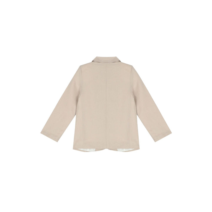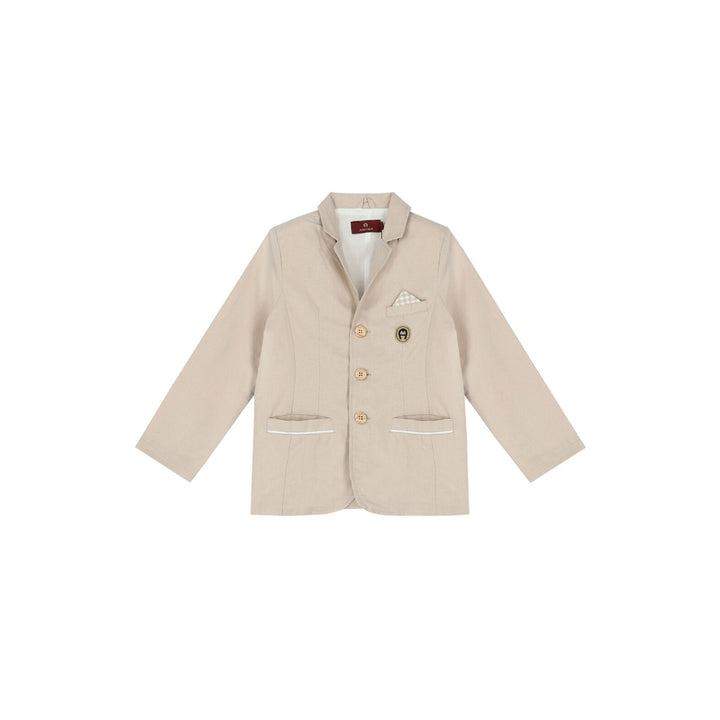 Beige blazer for boys by German designer Aigner. Made from a mid-weight soft cotton, it features the brands iconic horseshoe embroidered badge in gold and navy on the chest, two front pockets and a handkerchief pocket. Fastens with three branded butt